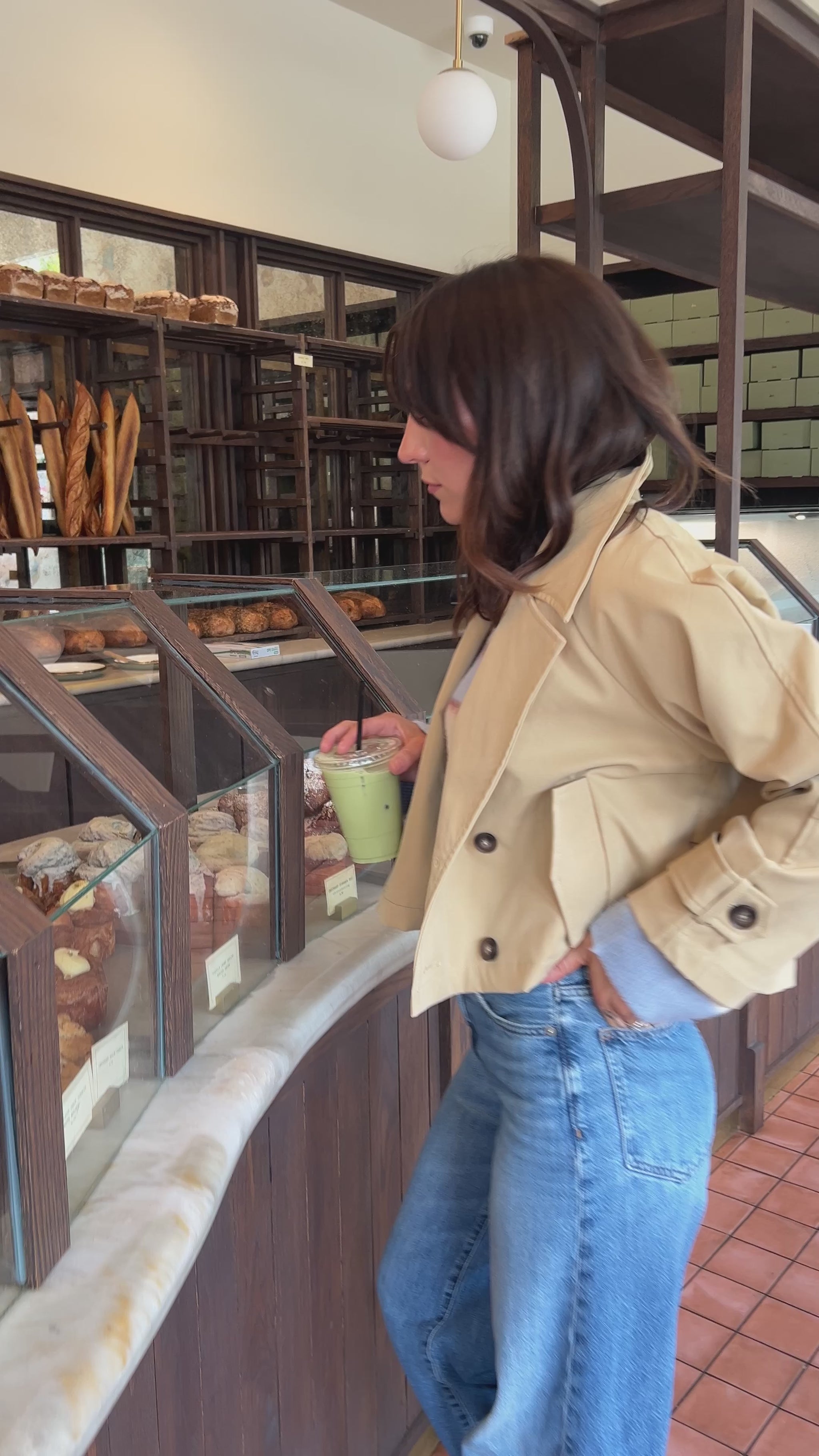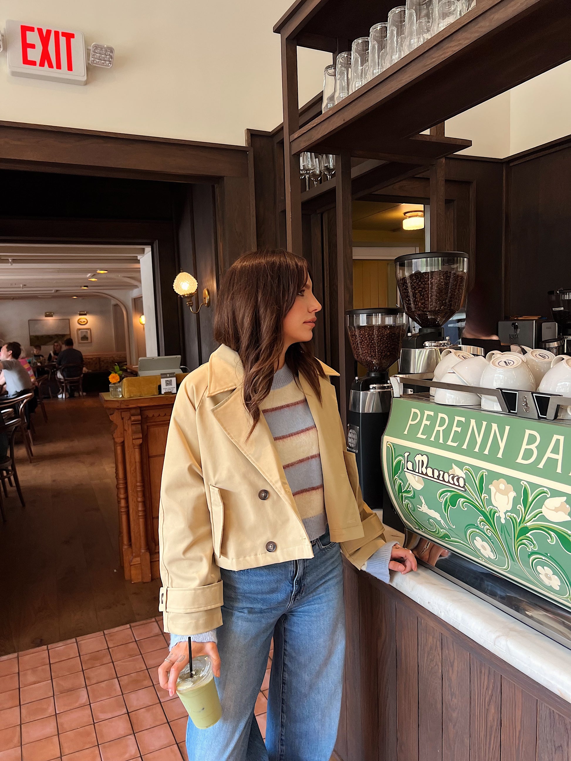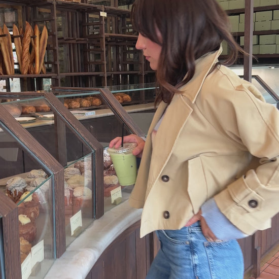 We’ve updated the timeless trench coat, which is once again a major trend. This jacket maintains the elements you’d expect in a trench, the collar, epaulets, back shield with buttons.